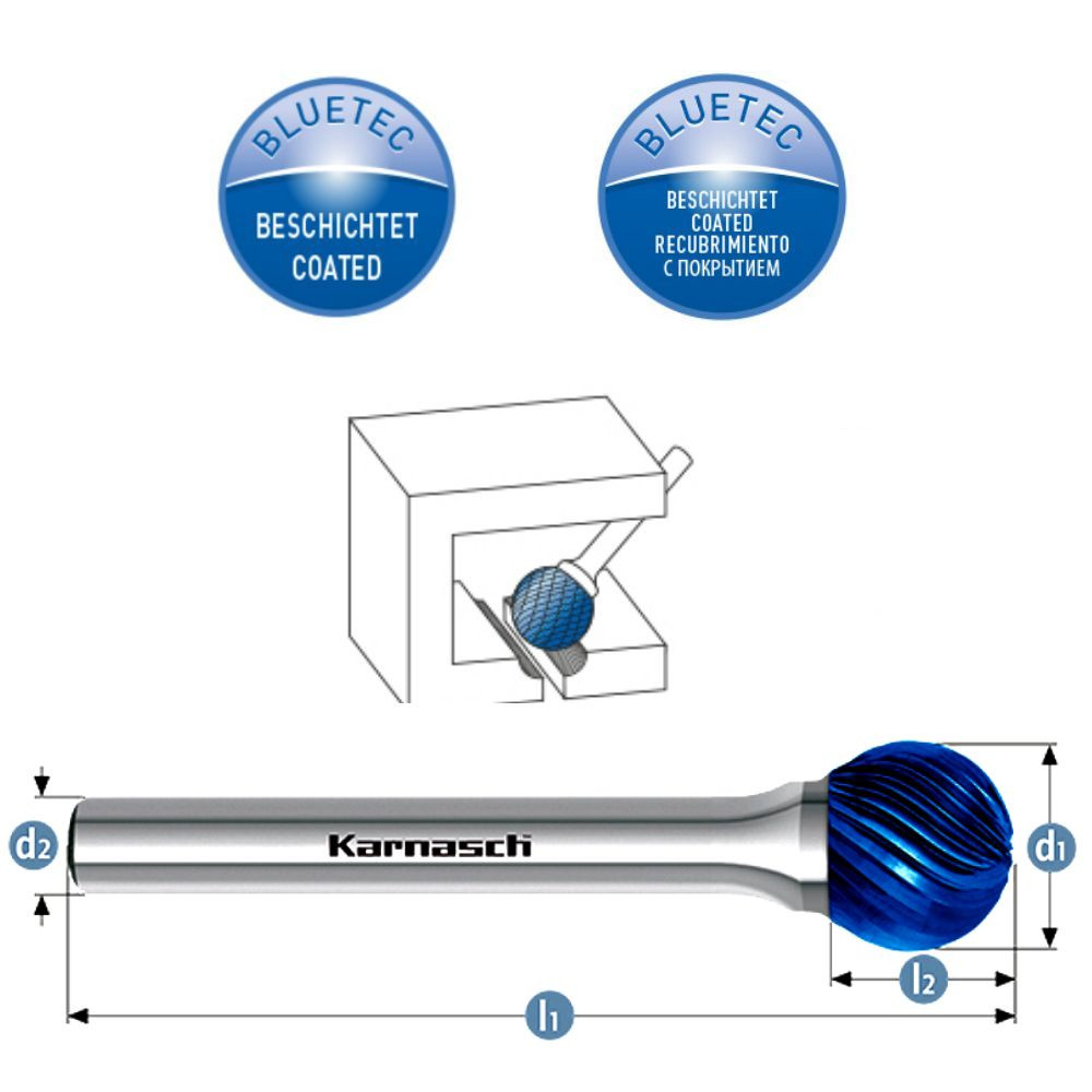 Für Frässtifte optimierte und patentierte BLUE-TEC-Beschichtung ergibt hohe Standzeiten und Performance in allen Stahlsorten.