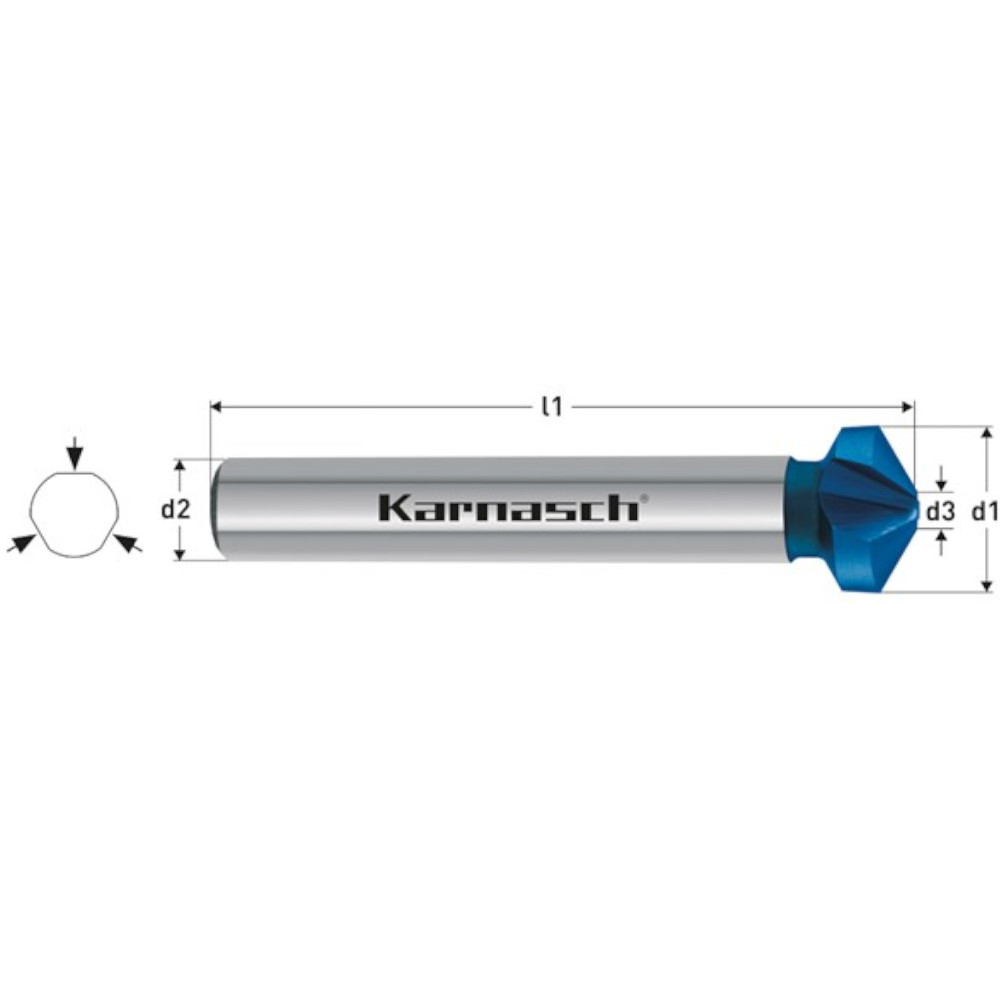 Produktinformationen "Kegelsenker 120°, HSS-XE + Blue-Tec, 3-Flächen-Schaft, Ø d1=6,3-25,0mm für Edelstahl"
