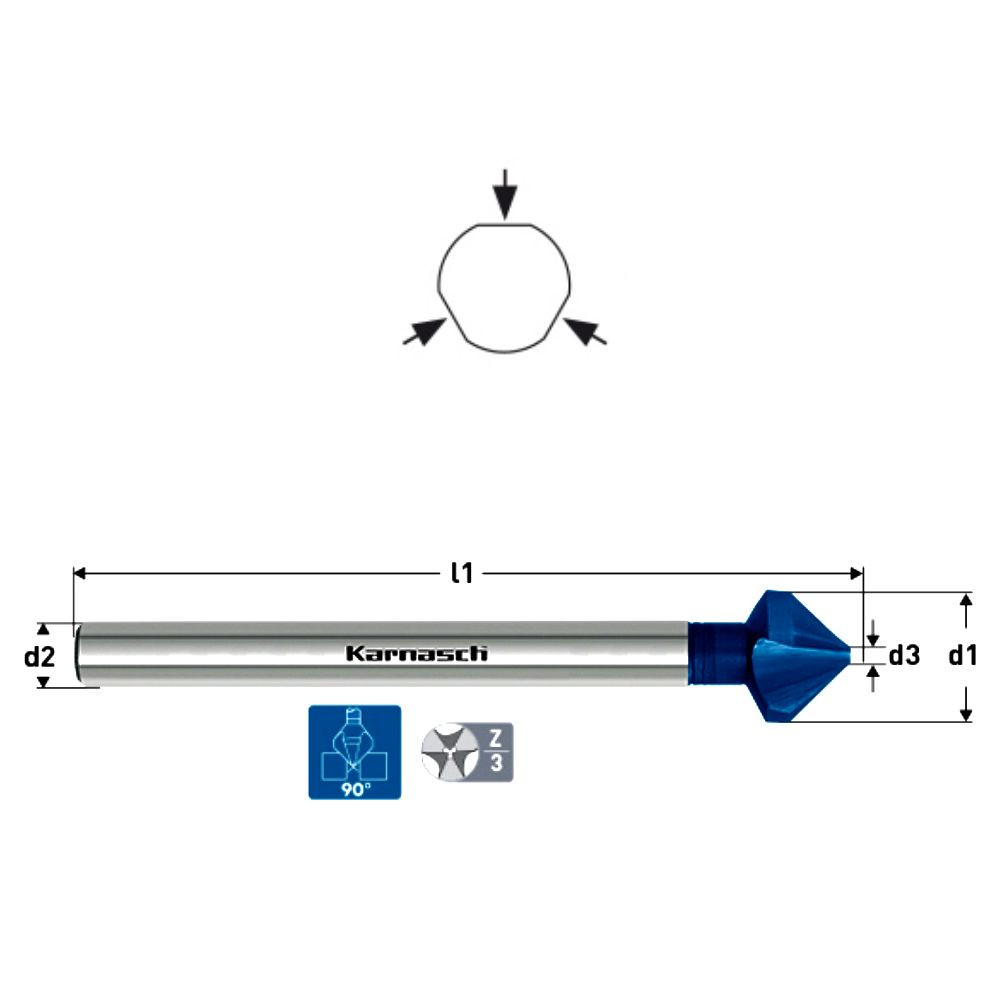 Produktinformationen "Kegelsenker 90°, langer Schaft, HSS-XE Blue-Tec, 3-Flächen-Schaft, Ø d1=6,3-25mm"