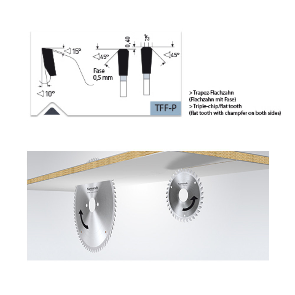 Produktinformationen "Kreissägeblätter HM bestückt Ø 250-500mm, formatieren, harte + abrasive Plattenmaterialien TFF-P"