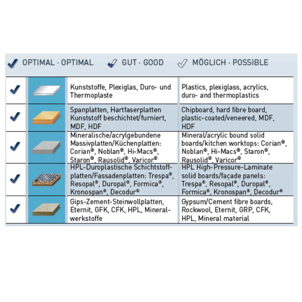 Ebenfalls ideal für Duroplaste wie HPL Schichtstoff (Trespa, Resopal) und Mineralwerkstoffe wie Corian, Noblan, Staron usw.