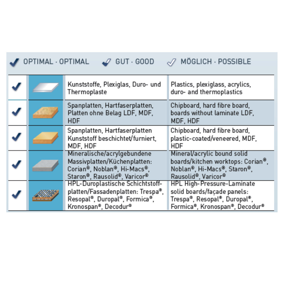 Für Fertigschnitte in thermoplastische Vollplatten (Acrylglas, PMMA, Polyäthylen, Ployamid usw.) und duroplastische Vollplatten (Schichtstoffe, HPL, Hartpapier, Trespa, Resopal, Multiplex).