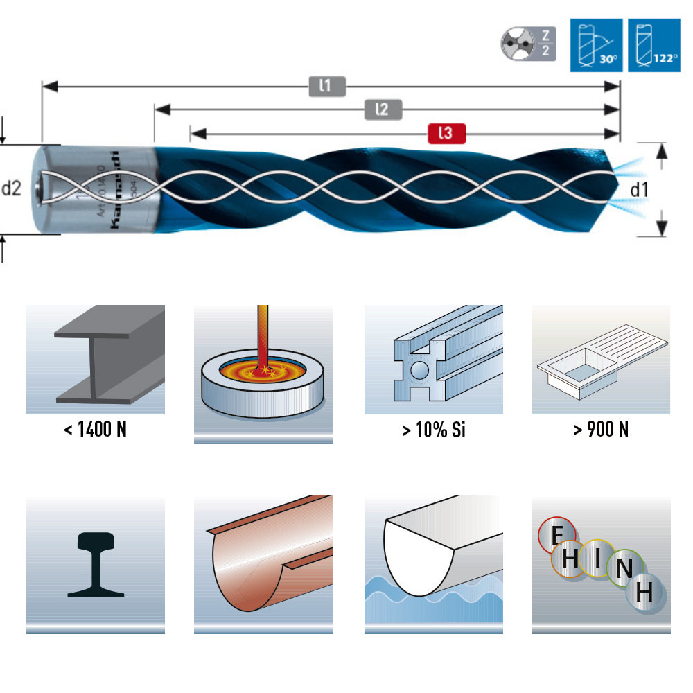 Zum Bohren aller Stähle bis 1400 N sowie in schwierigsten Materialien wie Edelstähle und exotische Legierungen.