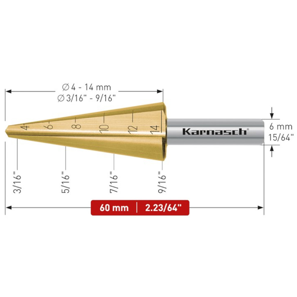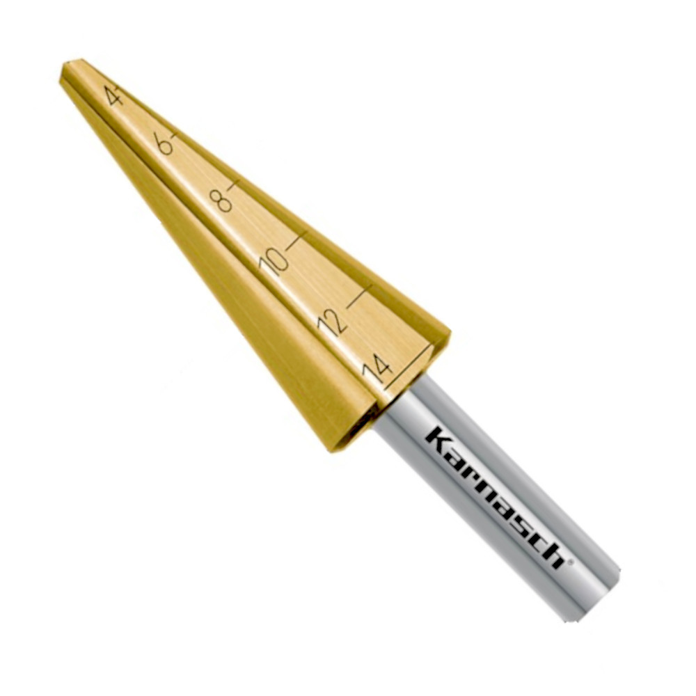 Der Stufenbohrer, Blechschälbohrer (213019) aus HSS-XE Stahl + TiN-GOLD Beschichtung, Gerade genutet mit Kreuzanschliff.
