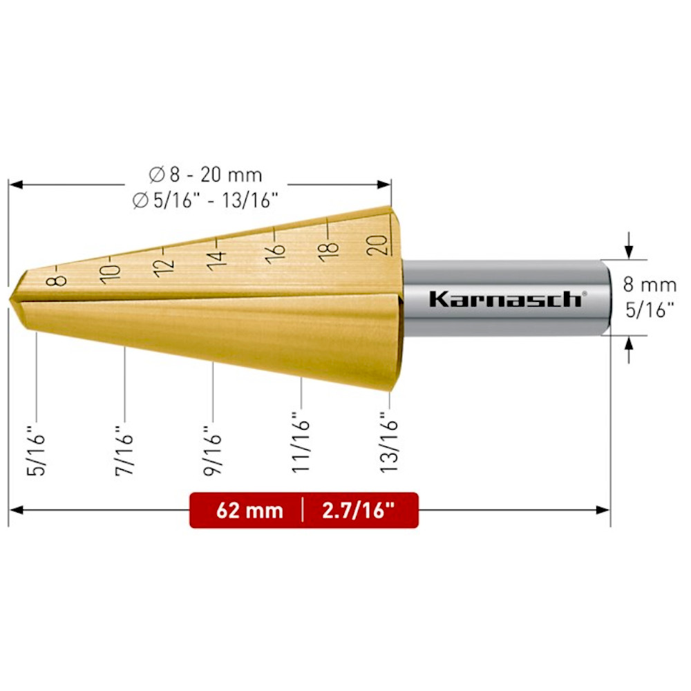 Dieses vielseitige Werkzeug vereint in sich unterschiedliche Bohrer mit den Durchmessern von 8 - 20 mm und 5/16" - 13/16".