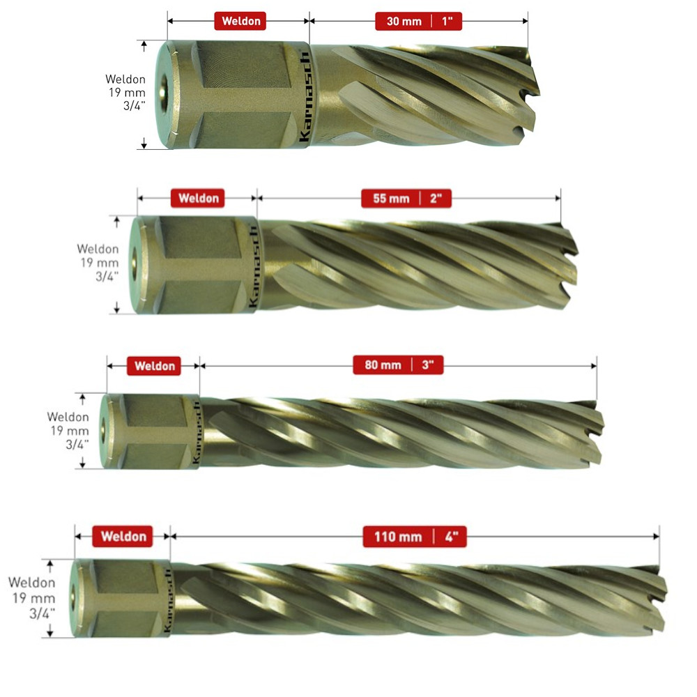 Kernbohrer Weldonschaft 3/4", Nutzlänge 30, 55, 80, 110mm, Gold Drill Line, d1=12-60mm