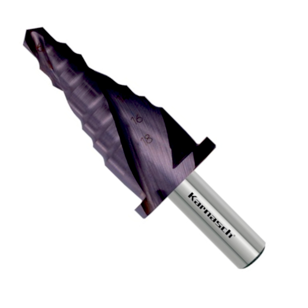 Stufenbohrer gefertigt aus HSS-XE Spezialstahl + TITAN-TEC Beschichtung für höchste Standzeiten auch bei Trockenbohrungen (Schneidöl empfohlen).