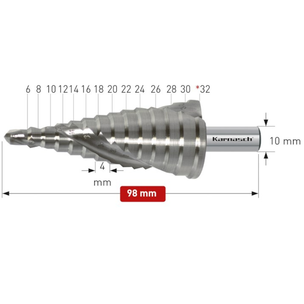 Der Karnasch Stufenbohrer aus HSS-XE Stahl, Spiral genutet mit Kreuzanschliff
