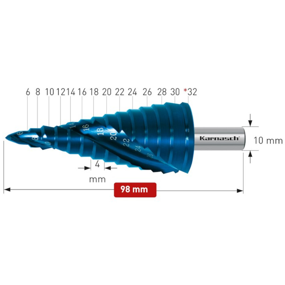 Stufenbohrer, Blechschälbohrer von 6-30mm, beschichtet von Karnasch mit 2 Schneiden