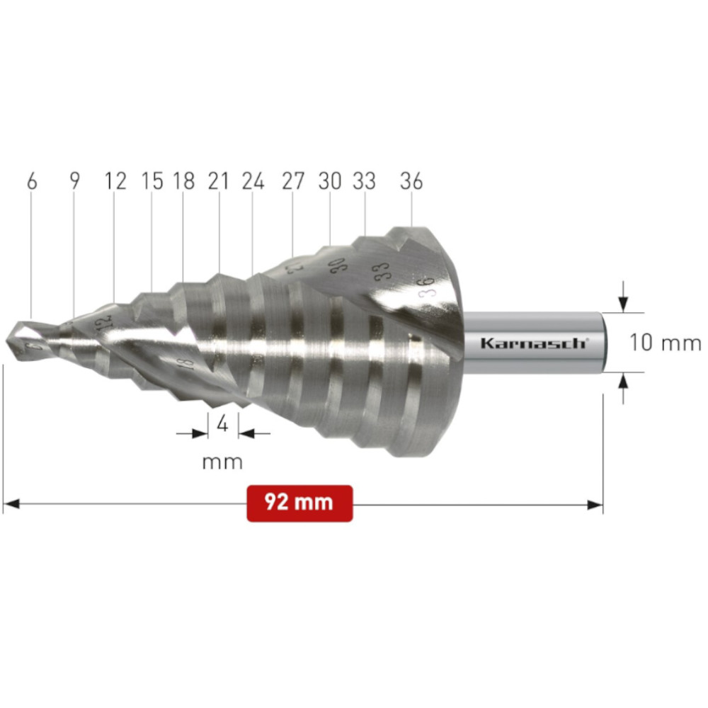 Stufenbohrer HSS-XE 6-36 mm, Spiral genutet, 2 Schneiden, CBN geschliffen, Kegelbohrer