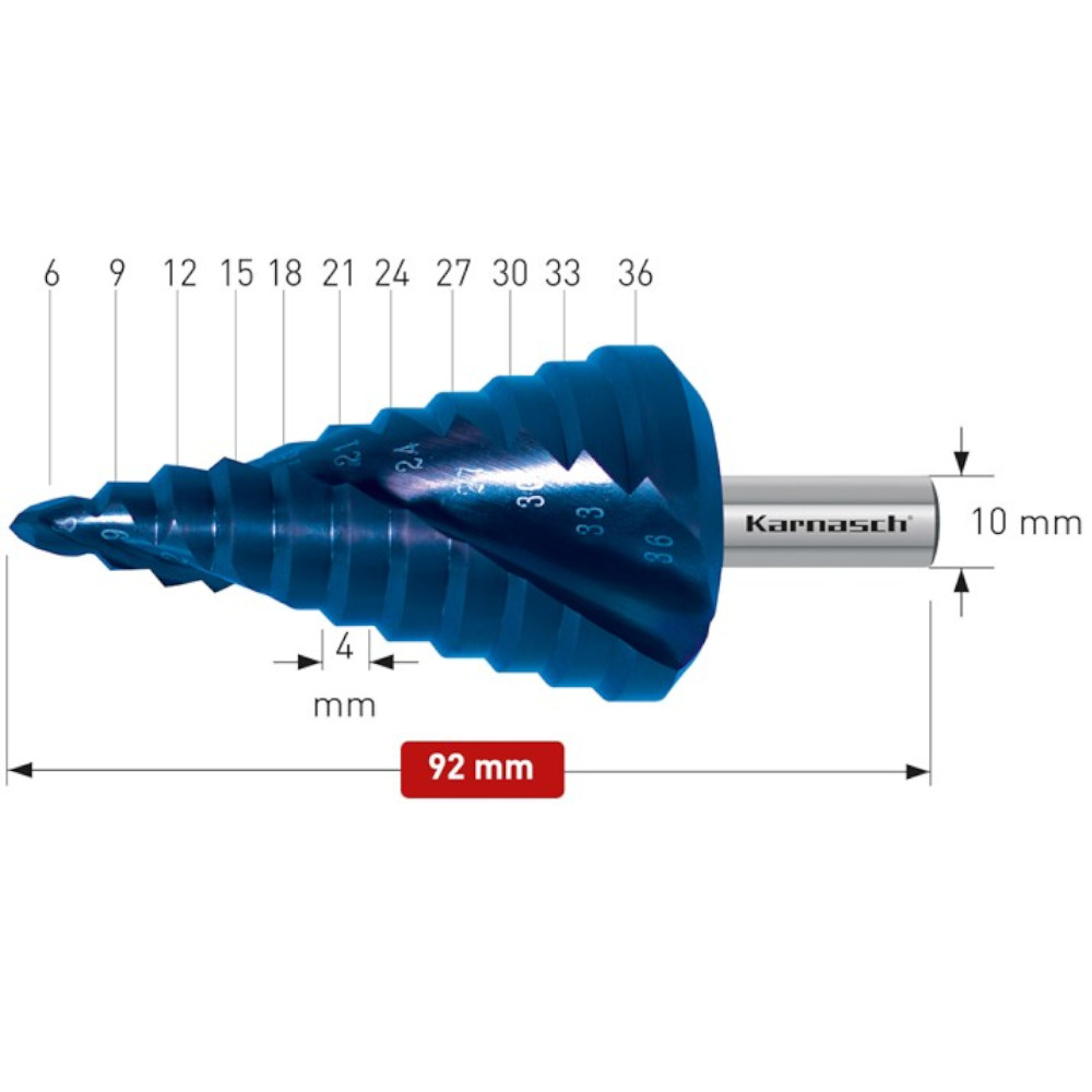 Der Professional Stufenbohrer aus HSS-XE Stahl + BLUE-DUR Beschichtung, Spiral genutet mit Kreuzanschliff.