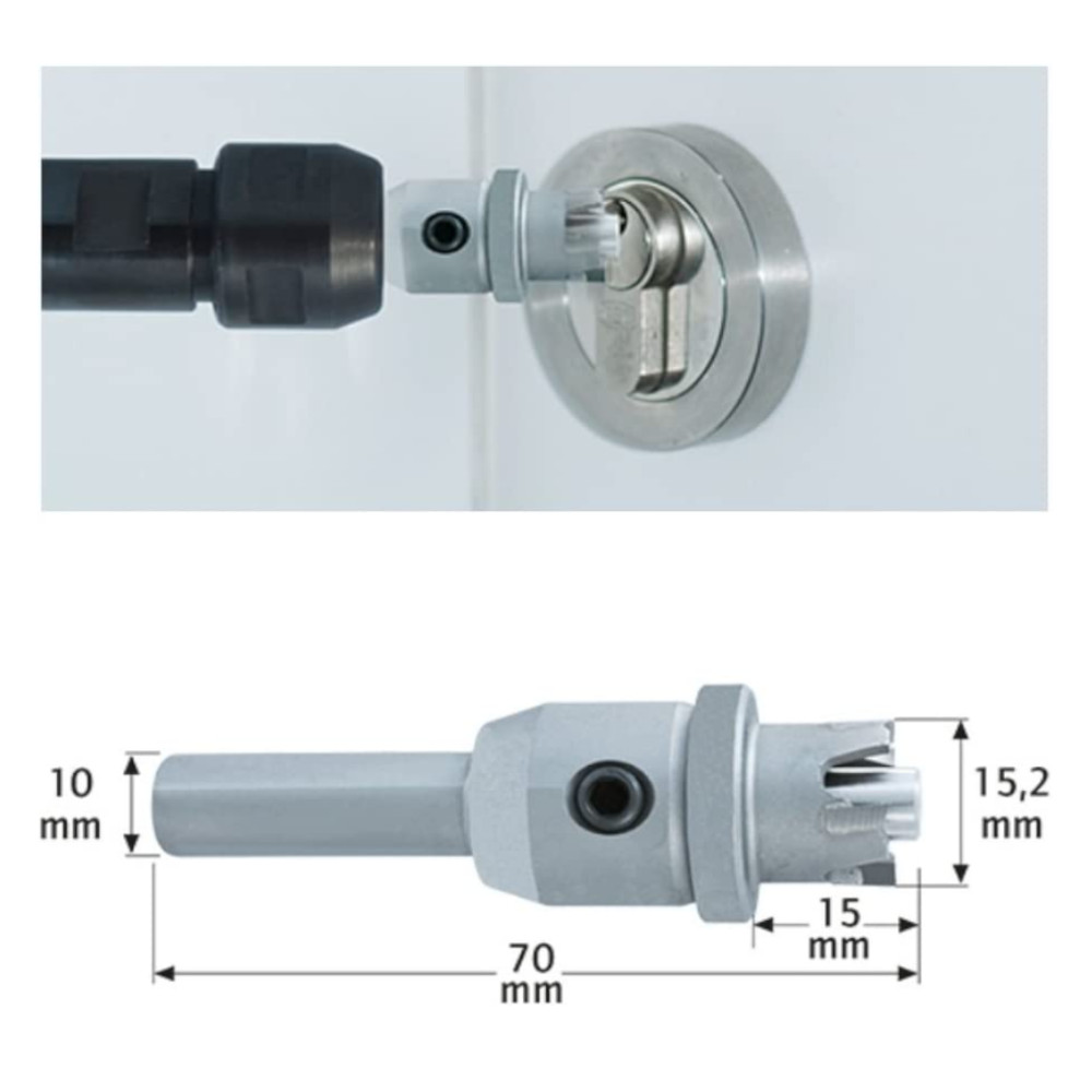 Zu verwenden mit einer Bohrmaschine oder starken Akku-Bohrmaschine.Mit dieser Lochsäge ist es möglich, die vor dem Kern liegende, gehärtete Stirnplatte dieses speziellen Hochsicherheitszylinders zu durchdringen, um anschließend den Kern herausziehen zu können.