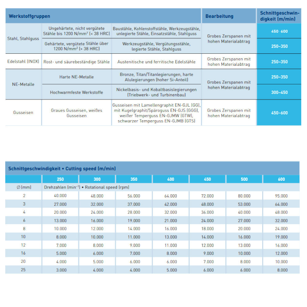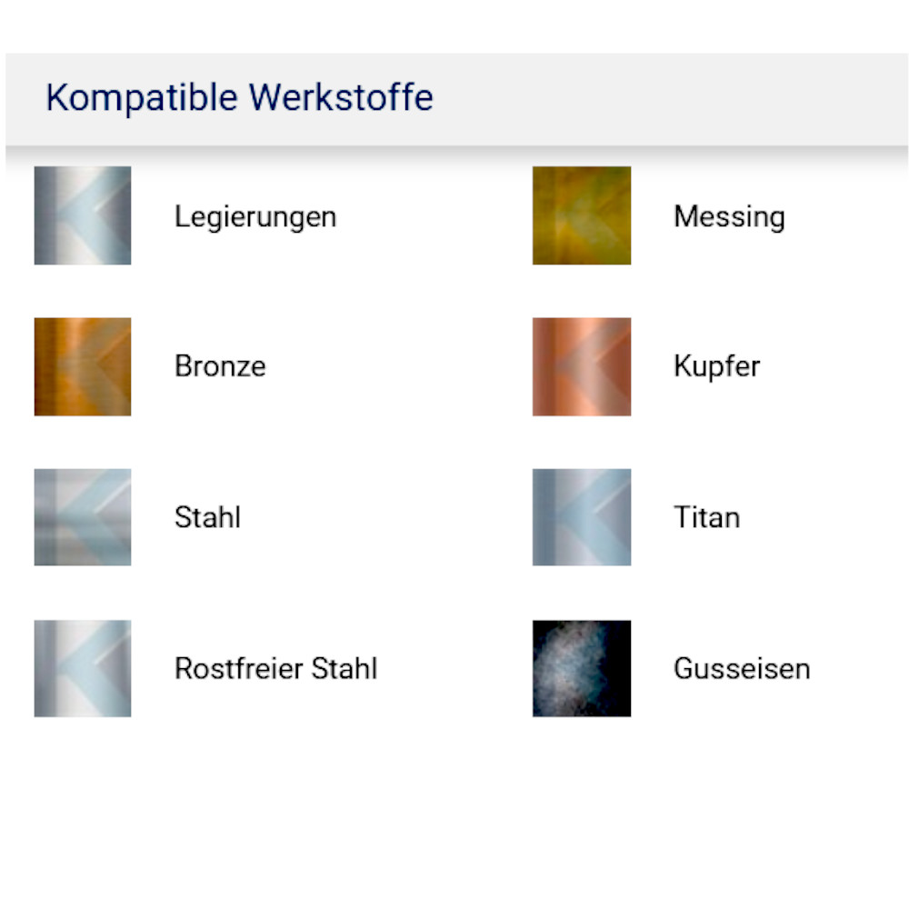 Anwendbar in den verschiedensten Materialien wie: Gusseisen, Stahl < 60 HRC, Edelstahl, [INOX], Nickelbasis- und Titanlegierungen, sowie Kupfer, Messing und Bronze.