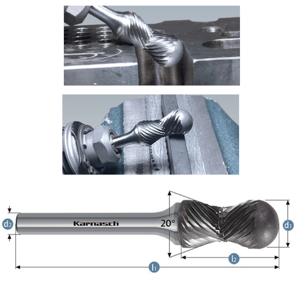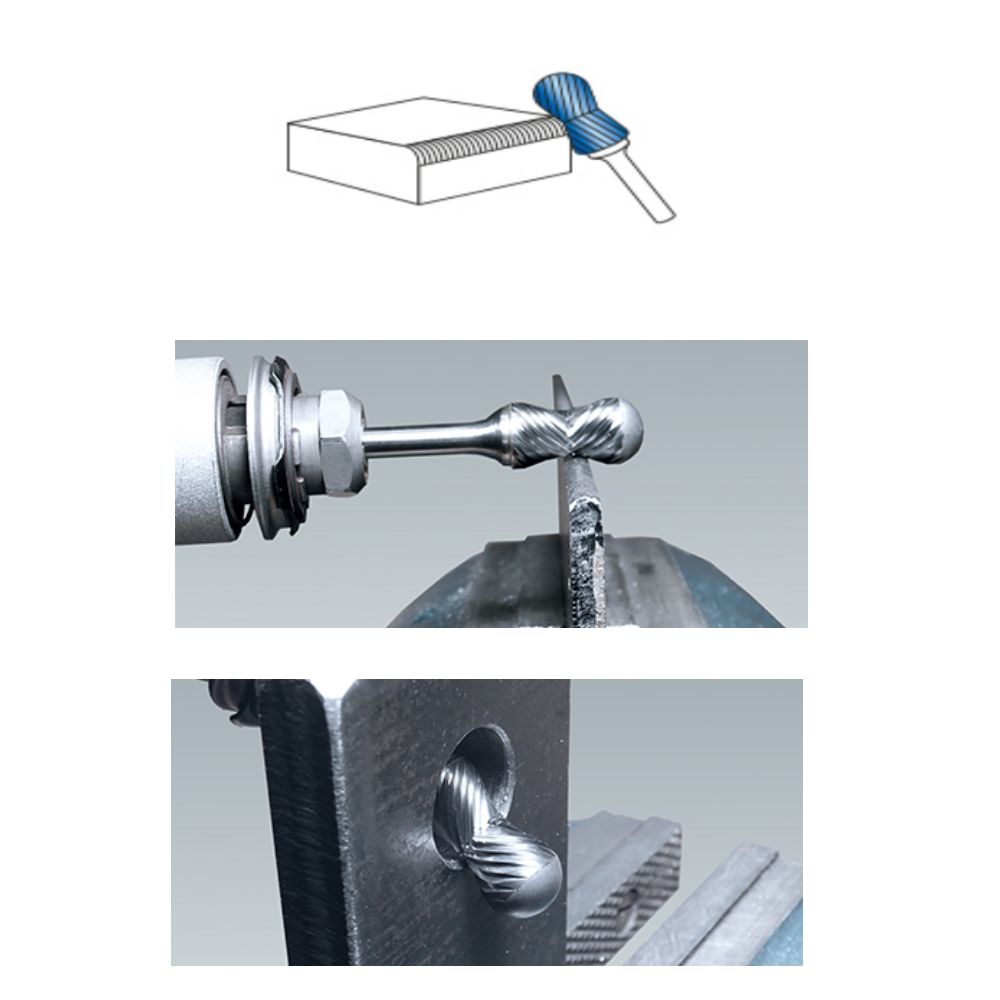 Der Radius an der Spitze des Rotierfräsers dient als Führung und Abstützung. Beschädigungen am Werkstück werden vermieden.