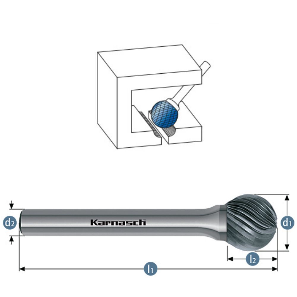 Hartmetall-Frässtift, KUD, Kugelform, HP-2 Verzahnung, unbeschichtet.