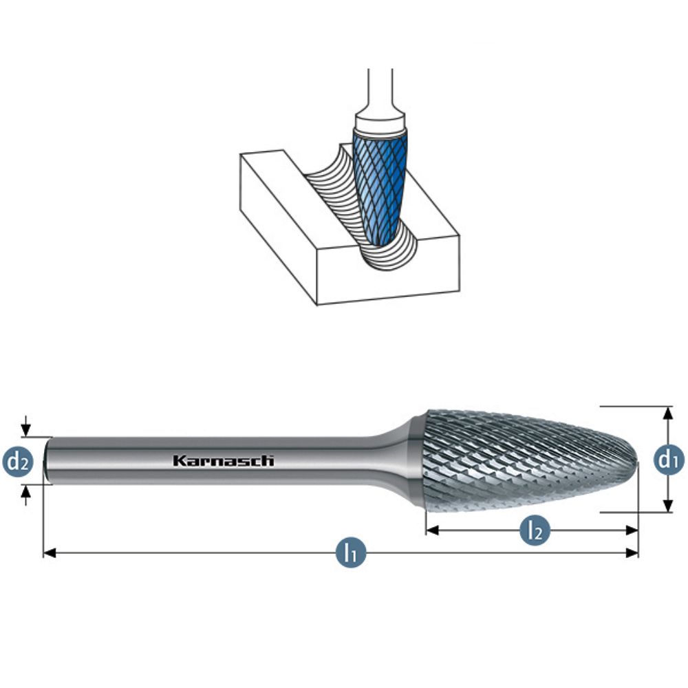 Hartmetall Frässtift, RBF, Rundbogenform HP-3 Verzahnung, unbeschichtet.