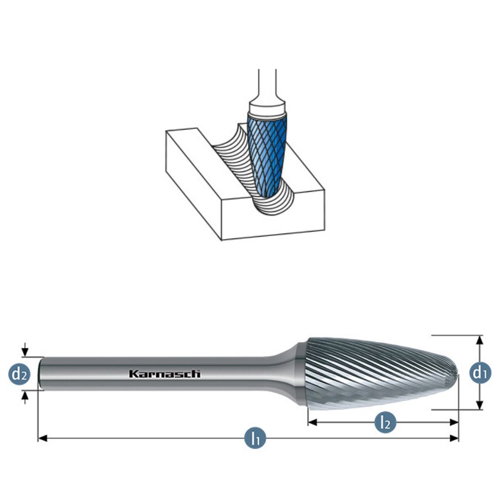 Hartmetall Frässtift, RBF, Rundbogenform, HP-5 Verzahnung, unbeschichtet.