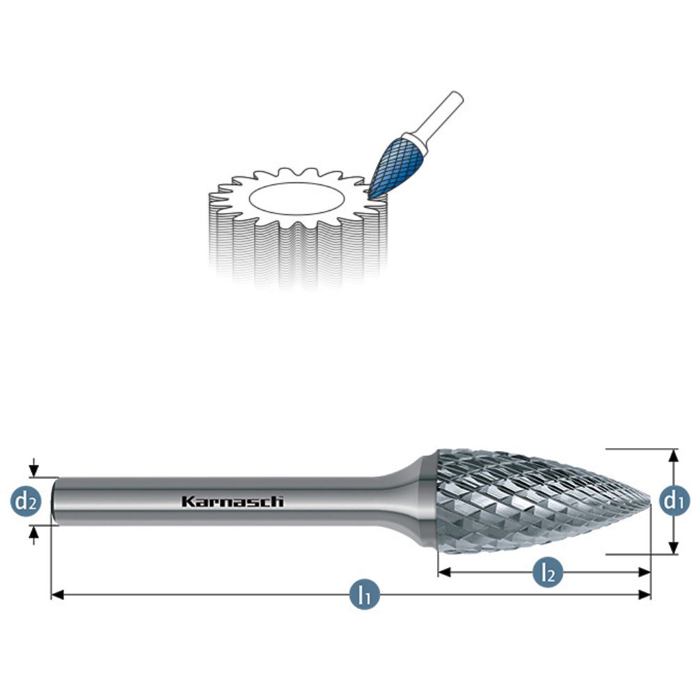 Dieser Frässtift in Spitzbogenform besitzt eine extrem grobe HP6 Kreuzverzahnung