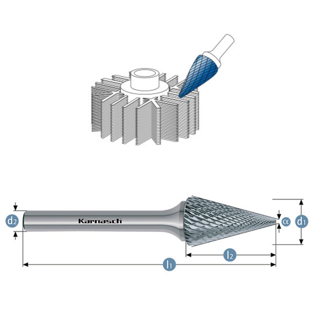 Ebenfalls ist dieser Spitzkegel Frässtift für Kupfer, Messing, Bronze, Nickel und Titan geeignet und online zu kaufen.