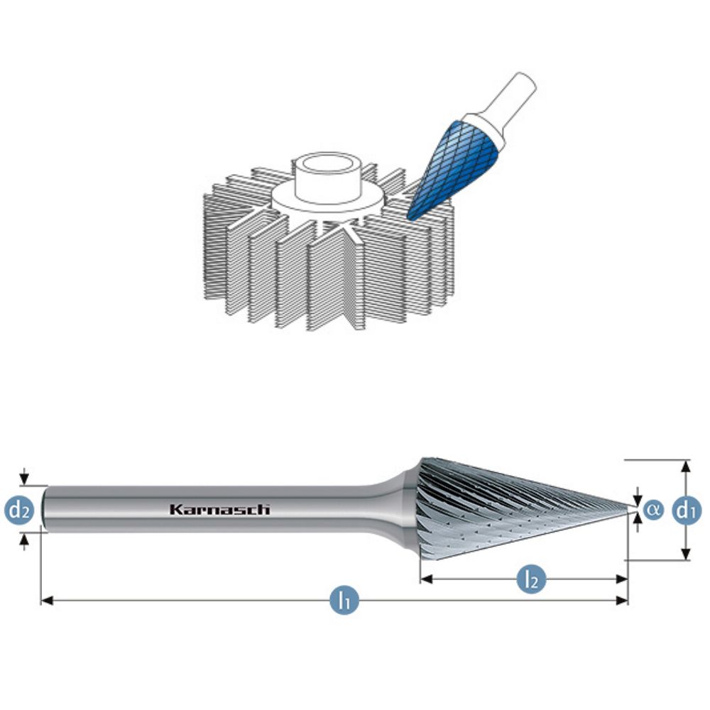 Dieser Frässtift von Karnasch in Spitzkegelform hat eine extrem robuste HP1 Verzahnung für Superlegierungen