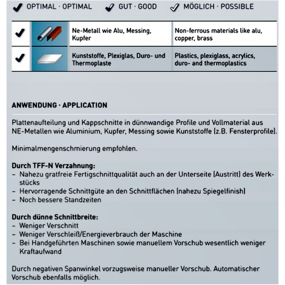 Optimal für Plattenaufteilung und Kappschnitte in dünnwandigen Profilen und Vollmaterial aus NE-Metallen wie Aluminium, Kupfer, Messing sowie Kunststoffen (z. B. Fensterprofile). Für beste Ergebnisse wird eine Minimalmengenschmierung empfohlen.