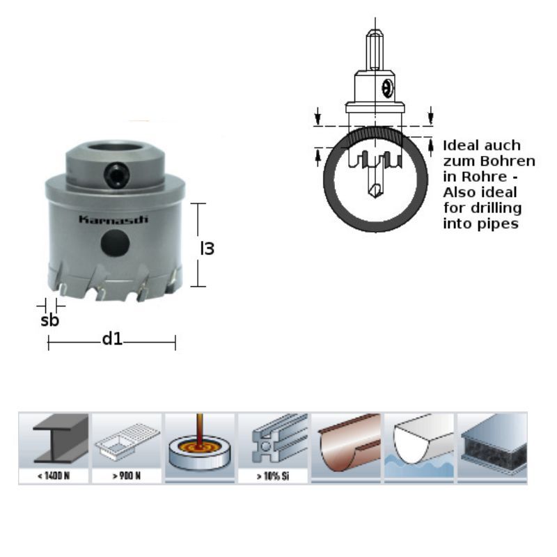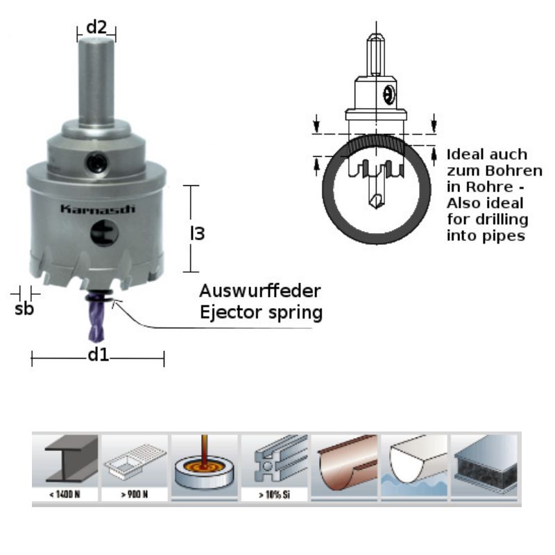 Superschwere Ausführung komplett mit Schaft, Zentrierbohrer mit Kreuzschliff und Auswurffeder oder wahlweise nur Lochsägenkörper. Das POWER-MAX Lochsägenprogramm ermöglicht das Bearbeiten nahezu aller Stahlsorten wie von Baustähle bis Edelstähle. Hervorragend ebenfalls zum Bohren in Nichteisenmetalle wie Aluminium, Kupfer und Messing. Ebenfalls ideal zum Bohren in Kunststoffe, CFK / GFK und Sandwich-Material. POWER-MAX Lochsägen sind im Durchmesserbereich von 14 bis 200mm, mit Schnitttiefen von 12 bis 65mm verfügbar.