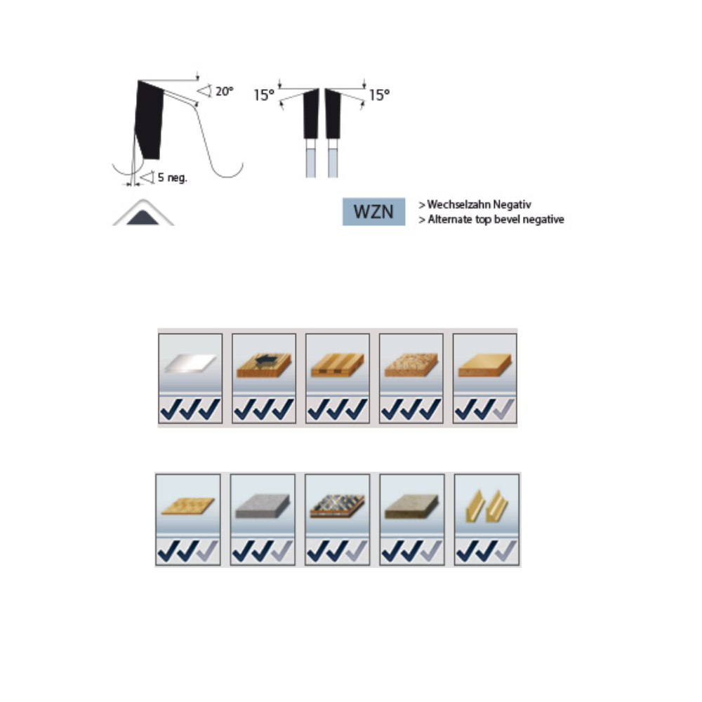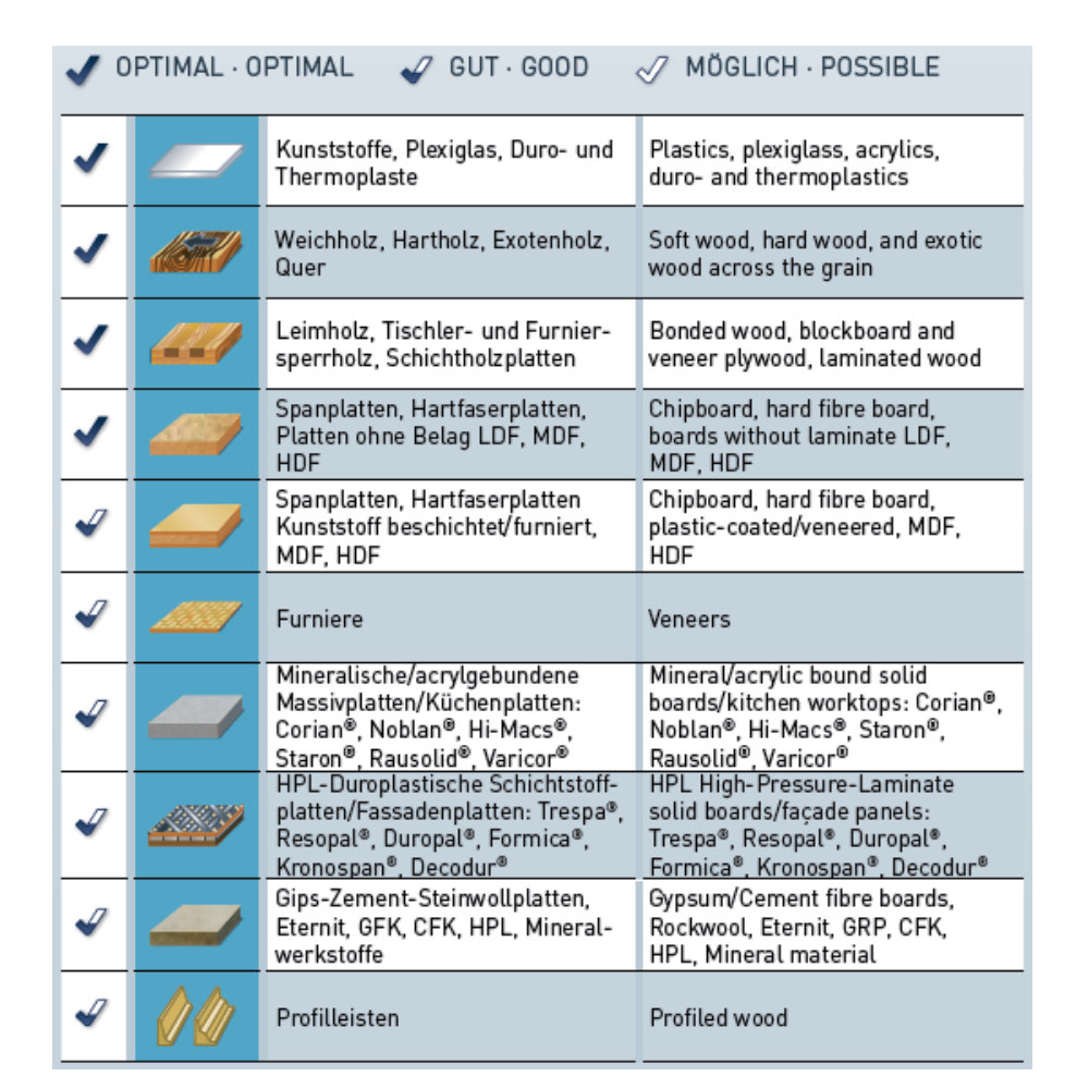 Für Querschnitte in Weich- und Hartholz, Holzmischwerkstoffe, Leimholz, Schichtholz, Plattenwerkstoffe furniert oder beschichtet.