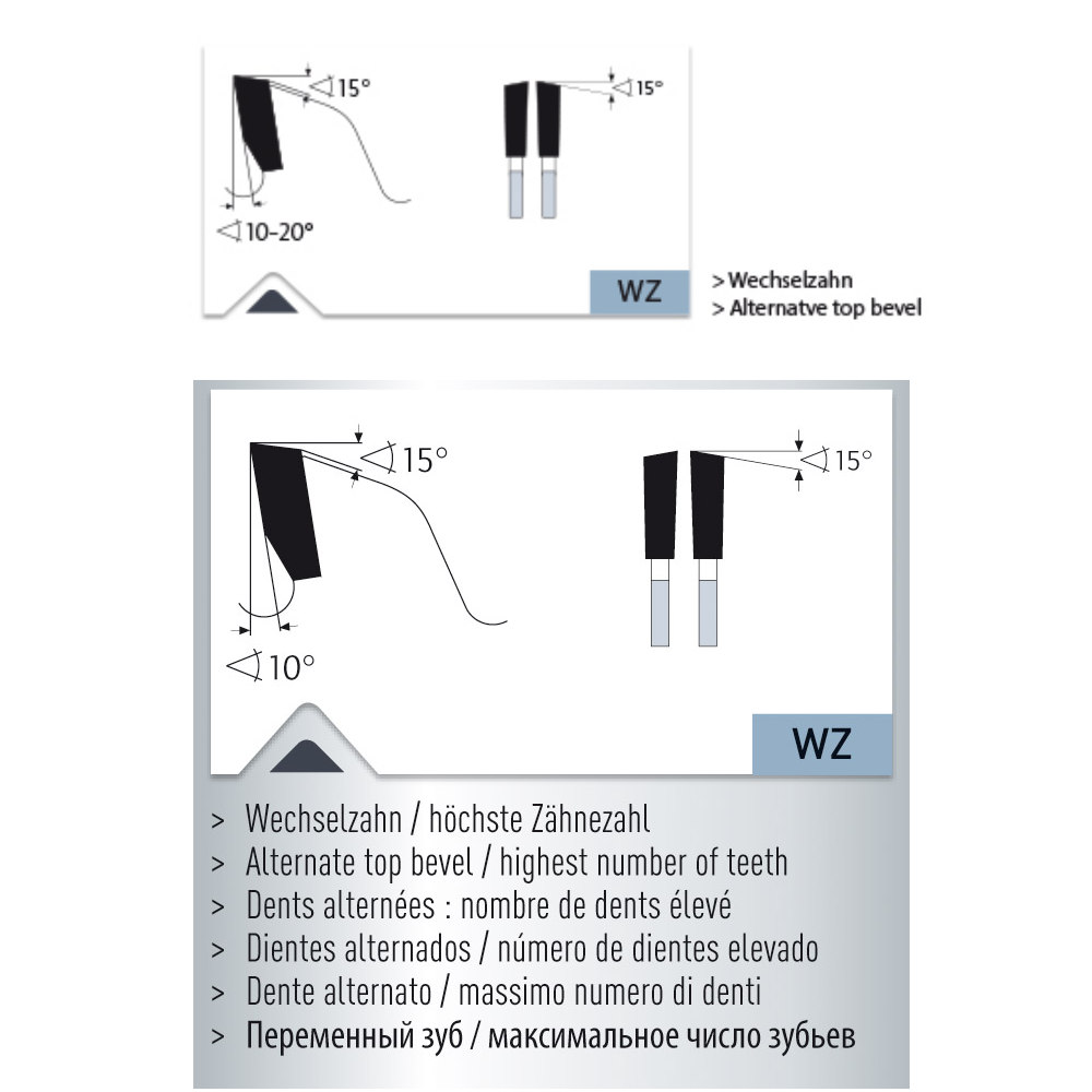 Niedere Zähnezahl: Grobe bis mittlere Schnittqualität in alle Holzwerkstoffe, Edelhölzer und Massivholz längs- und quer. Plattenwerkstoffe einseitig furniert oder Kunststoff beschichtet, Hardgewebe, Hartpapier, dickere Kunststoffprofile und Platten (Thermoplaste). Hoher Vorschub möglich.