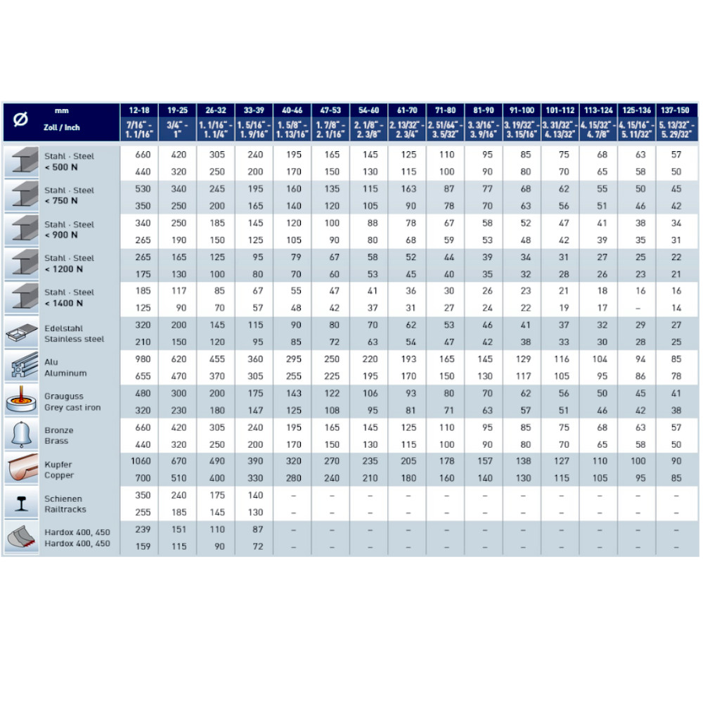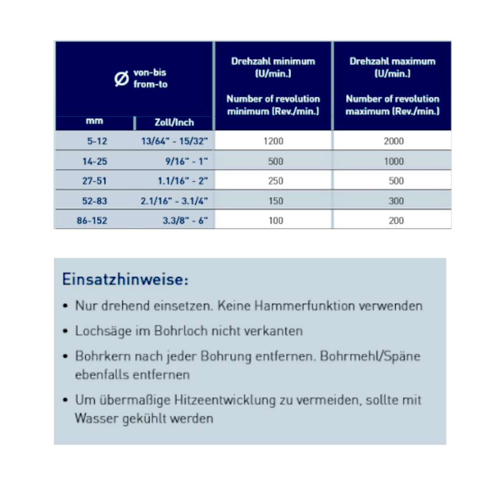 | Durchmesser Lochsäge in mm: | 14mm, 16mm, 19mm, 20mm, 22mm, 25mm, 28mm, 30mm, 32mm, 35mm, 38mm, 41mm, 45mm, 48mm, 50mm, 54mm, 57mm, 60mm, 65mm, 68mm, 70mm, 73mm, 76mm, 79mm, 83mm, 86mm, 89mm, 92mm, 95mm, 98mm, 102mm, 114mm, 127mm, 133mm, 140mm, 146mm, 152mm |