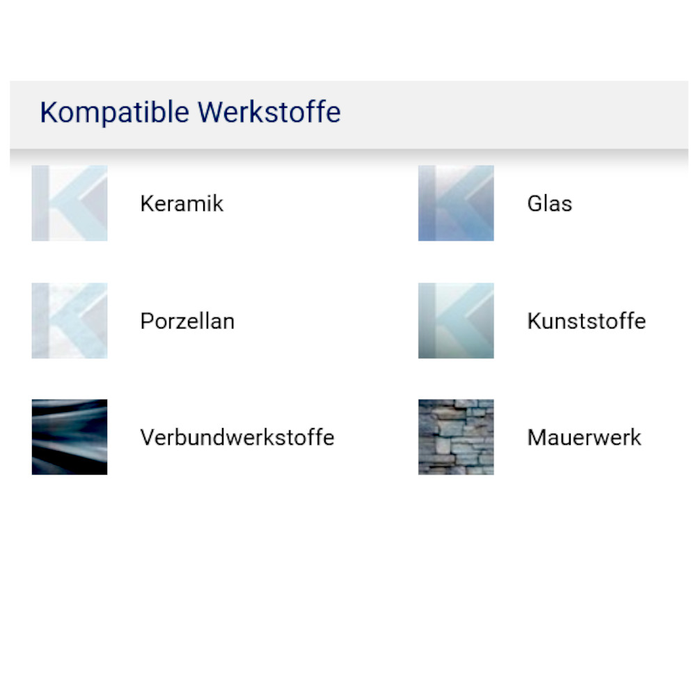 Perfekt für den Einsatz in abrasiven und sehr harten Materialien wie Glas, glasfaser- und kohlefaserverstärkte Kunststoffe, Verbundwerkstoffe, Keramik, Stein, Porzellan und Mauerwerk.