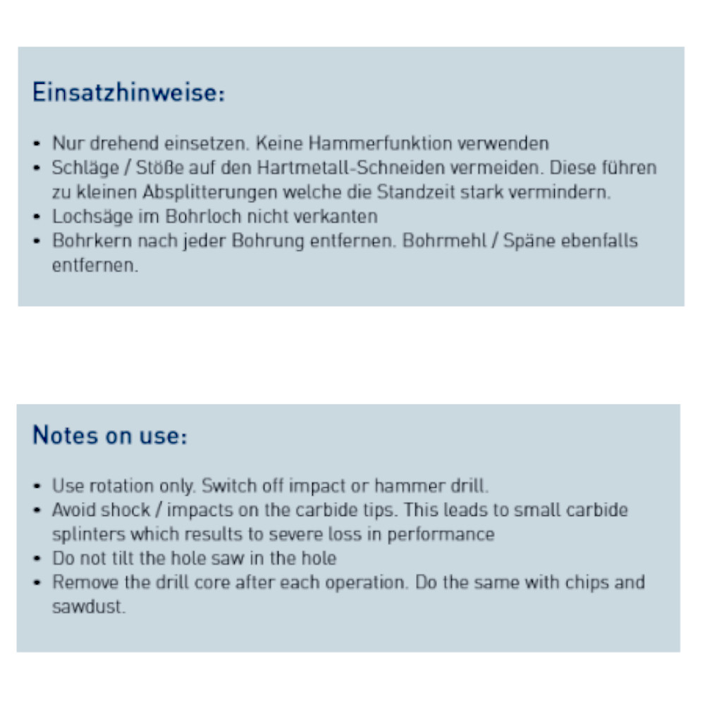 Die Lochsäge nur drehend einsetzen und ohne Hammerfunktion verwenden.