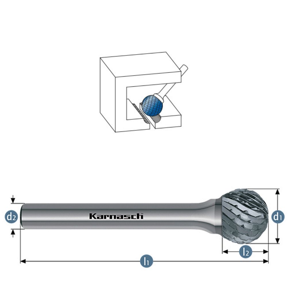 Hartmetall-Frässtift, KUD, Kugelform, HP-6 Verzahnung, unbeschichtet.
