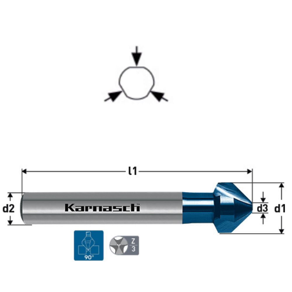 Produktinformationen "Kegelsenker 90°, HSS-XE Blue-Tec beschichtet, 3-Flächen-Schaft, DIN 335, Ø d1=4,3-40mm"